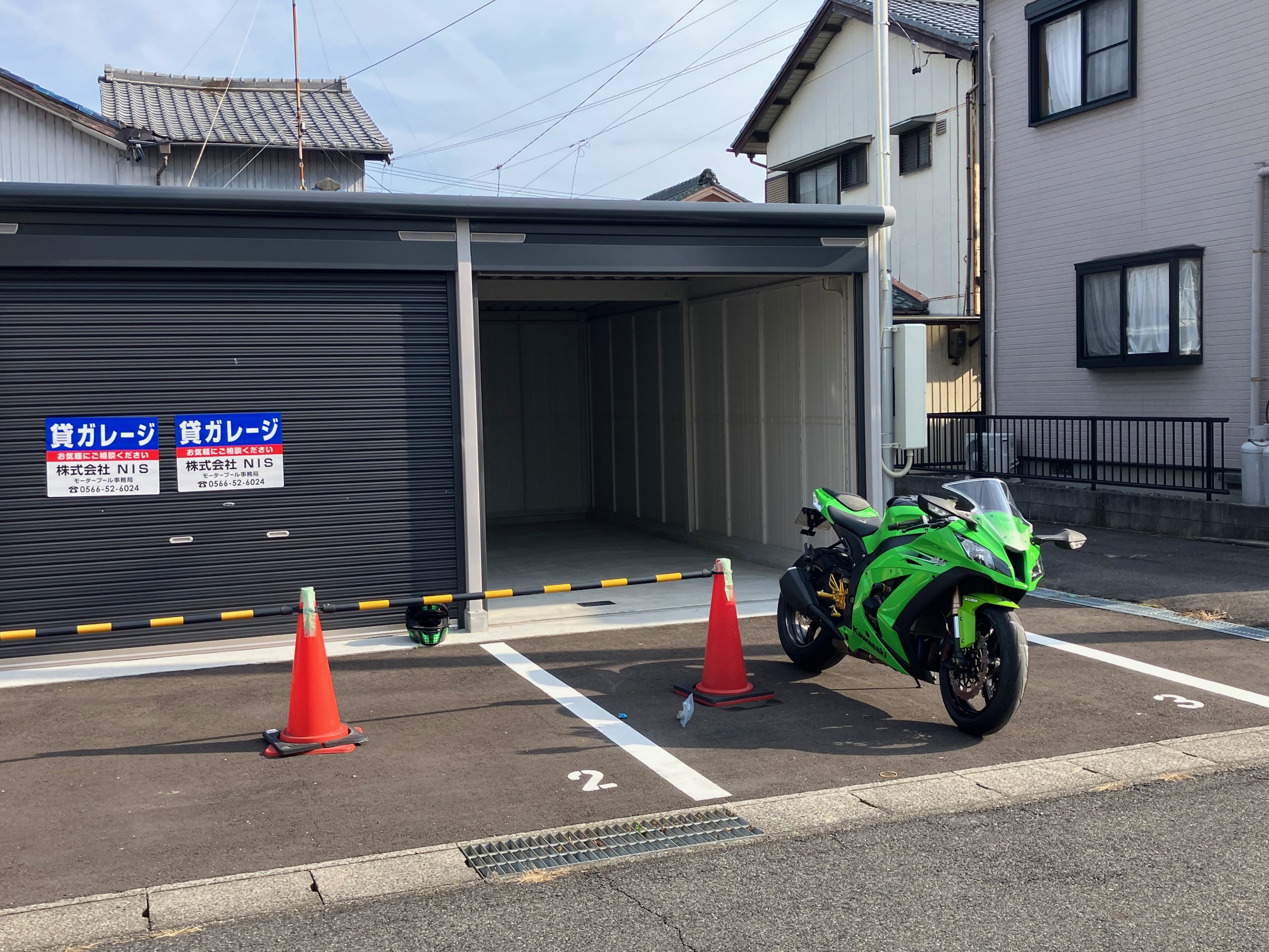 緑色の大型のオートバイでご来社です。スペースを有効に使えるスペース3をご所望の様子です。