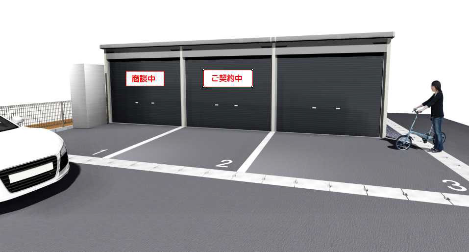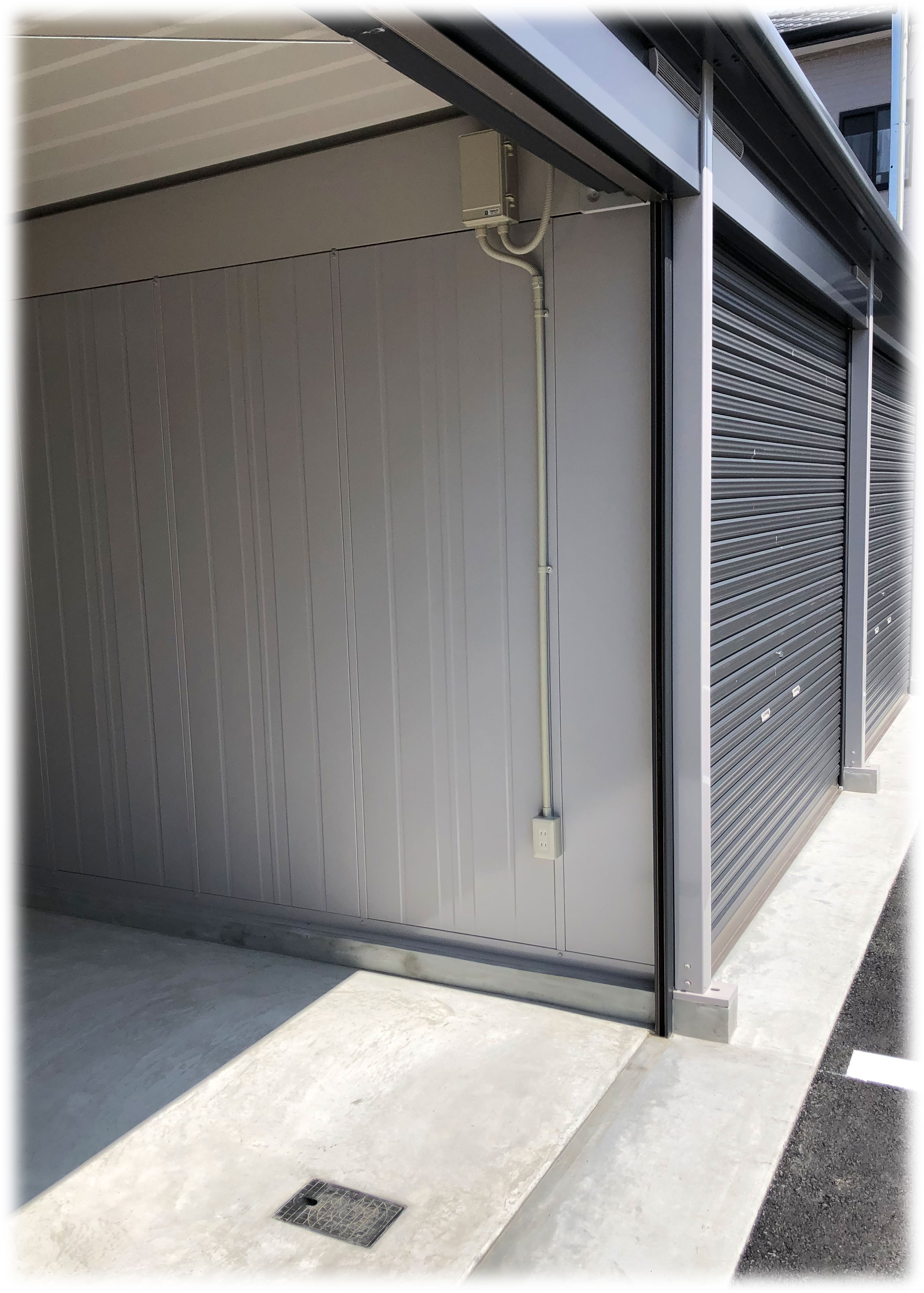 スチール鋼材で作られたガレージに手動式シャッターがつきます。今回のサイトは3連棟で電気・水道・WIFIが標準装備となります。